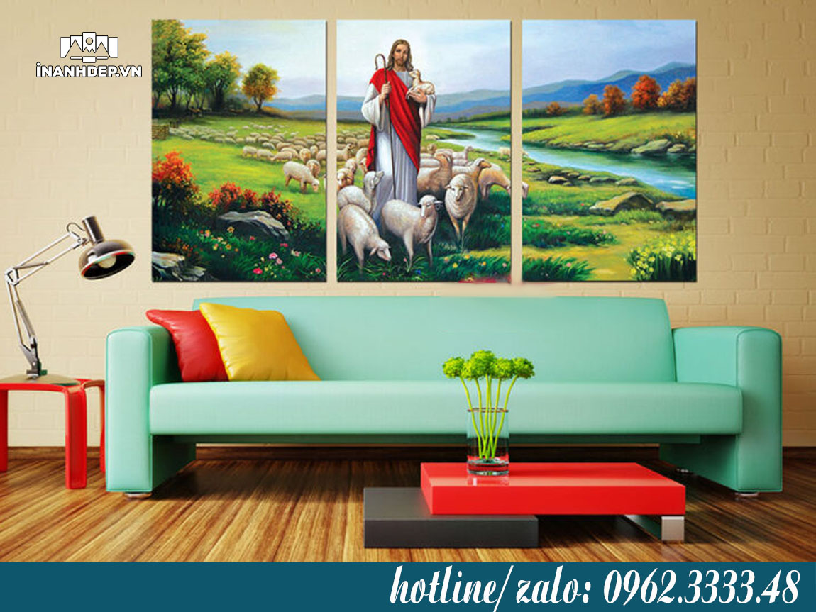Phòng khách đa số không gian rộng lớn vì thế nên chọn tranh kích thước lớn, hình ảnh nhẹ nhàng, trang nhã như Chúa Lòng Thương Xót hoặc Chúa Chăn Chiên. Có thể chọn 1 tranh lớn hoặc bộ 3 tranh đến 5 tranh ghép lại để tạo điểm nhất cho không gian.