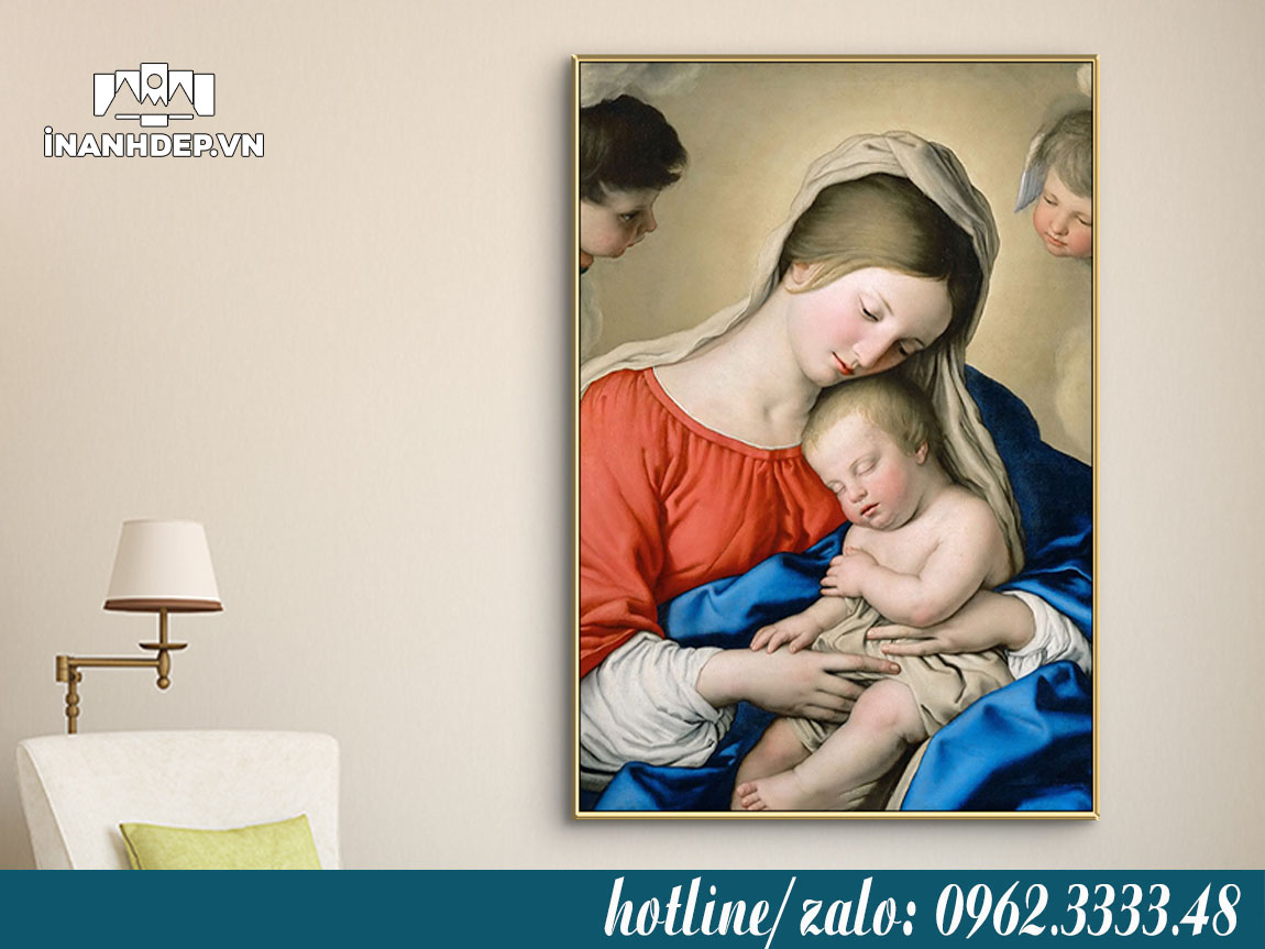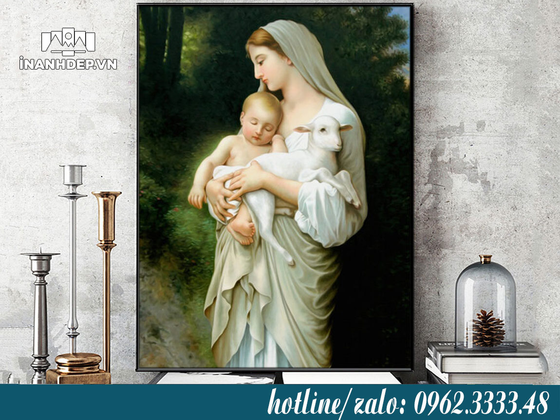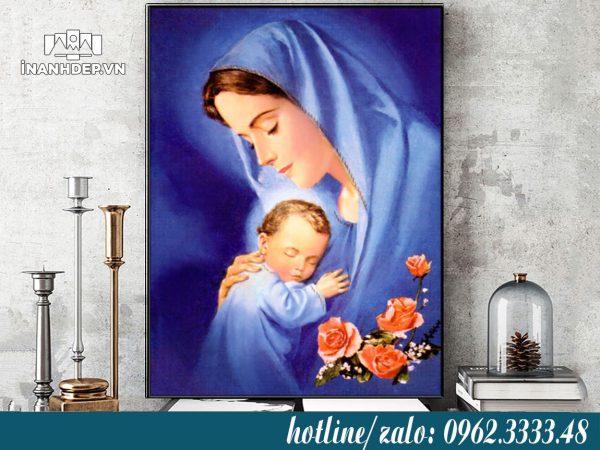 Hình ảnh Đức Mẹ Maria bế Chúa Hài Đồng hoặc đứng trong ánh sáng thể hiện tình mẫu tử bao la và sự che chở vô điều kiện. Treo một bức tranh Đức Mẹ Maria trong phòng thờ hoặc phòng khách giúp người xem cảm nhận được sự ấm áp, bình an và gần gũi với đức tin.